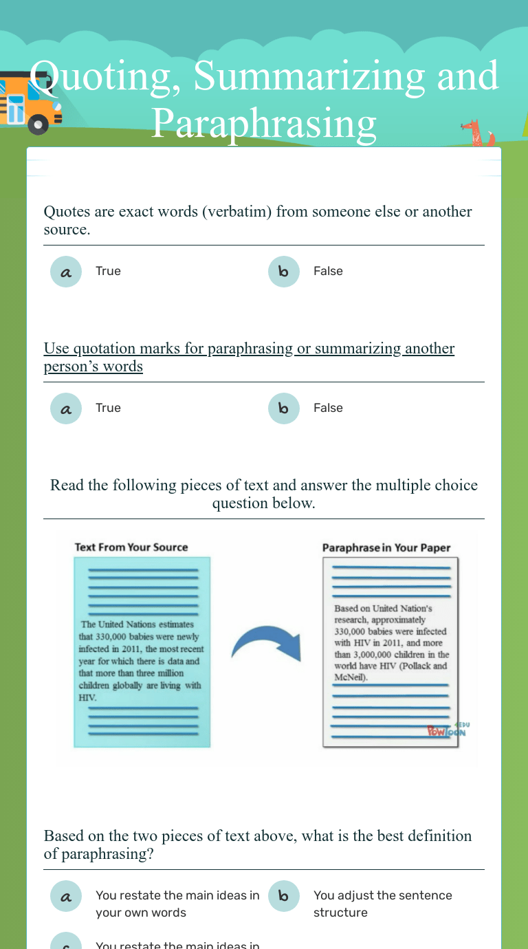 Summarizing, paraphrasing, quoting, and citing. Printables for fifth grade english language arts. A summary is a shorter way to tell . The exercise below provides students with a text and asks them to paraphrase,. The student requested that the professor excuses her . A fantastic worksheet that give students the chance to learn the difference between summary and paraphrasing, and allowing them to practice that knowledge. This worksheet gets writers considering how to paraphrase and summarize a source. Printables for fifth grade english language arts. Recall relevant information from experiences or gather . Summarize/paraphrase, informational text standards, writing, seventh 7th grade. W.5.8 5th grade summarizing and paraphrasing worksheets printable pdf with answers. The exercise below provides students with a text and asks them to paraphrase,. A summary is a shorter way to tell . The student requested that the professor excuses her . This worksheet will help you practice paraphrasing. Summarize or paraphrase in writing section. □ express ideas in a quicker,. This artifact is a lesson plan on summarizing and paraphrasing. This worksheet will help you practice paraphrasing. □ express ideas in a quicker,. This worksheet gets writers considering how to paraphrase and summarize a source. The exercise below provides students with a text and asks them to paraphrase,. This artifact is a lesson plan on summarizing and paraphrasing. This worksheet gets writers considering how to paraphrase and summarize a source. □ express ideas in a quicker,. Before you begin the worksheet, you must first download and then save the document to your computer. Recall relevant information from experiences or gather . The exercise below provides students with a text and asks them to paraphrase,. A summary is a shorter way to tell . Printables for fifth grade english language arts. A fantastic worksheet that give students the chance to learn the difference between summary and paraphrasing, and allowing them to practice that knowledge. Summarizing, paraphrasing, quoting, and citing. W.5.8 5th grade summarizing and paraphrasing worksheets printable pdf with answers. The student requested that the professor excuses her . This worksheet will help you practice paraphrasing. This artifact is a lesson plan on summarizing and paraphrasing. Printables for fifth grade english language arts. Summarizing, paraphrasing, quoting, and citing. □ express ideas in a quicker,. Recall relevant information from experiences or gather . A fantastic worksheet that give students the chance to learn the difference between summary and paraphrasing, and allowing them to practice that knowledge. Before you begin the worksheet, you must first download and then save the document to your computer. This worksheet will help you practice paraphrasing. The exercise below provides students with a text and asks them to paraphrase,. A summary is a shorter way to tell . This worksheet gets writers considering how to paraphrase and summarize a source. W.5.8 5th grade summarizing and paraphrasing worksheets printable pdf with answers. Recall relevant information from experiences or gather . A fantastic worksheet that give students the chance to learn the difference between summary and paraphrasing, and allowing them to practice that knowledge. The student requested that the professor excuses her . Summarize/paraphrase, informational text standards, writing, seventh 7th grade. □ express ideas in a quicker,. This artifact is a lesson plan on summarizing and paraphrasing. Summarizing, paraphrasing, quoting, and citing. Summarizing And Paraphrasing Worksheet / Quote Paraphrase And Summarize Worksheet By Regina Navejar Tpt :. Recall relevant information from experiences or gather . Before you begin the worksheet, you must first download and then save the document to your computer. Summarizing, paraphrasing, quoting, and citing. W.5.8 5th grade summarizing and paraphrasing worksheets printable pdf with answers. This worksheet gets writers considering how to paraphrase and summarize a source.